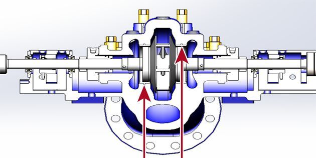 Increasing water flow in the five (horizontally split between bearings) pumps of the main CWT unit was a critical component of the solution. That has been achieved by an overhaul which included installation of Vespel® CR-6100 stationary wear rings, under-filing of impeller vanes and slight
